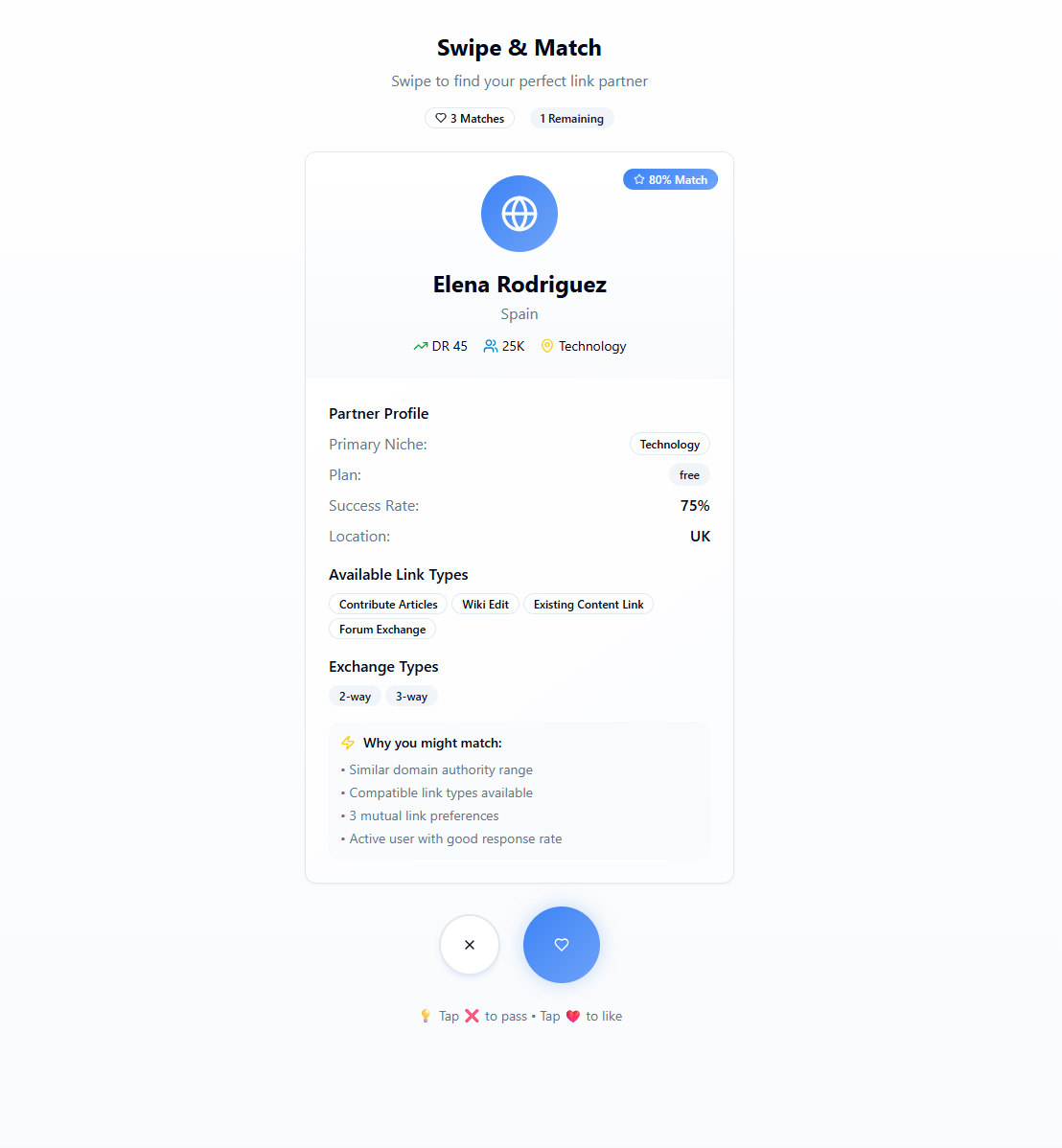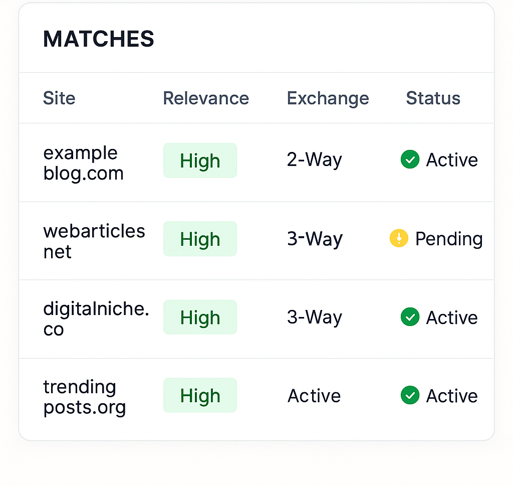 A smarter way to build high-quality three-way backlinks. No outreach. No cold emails. Just verified, relevant partners.